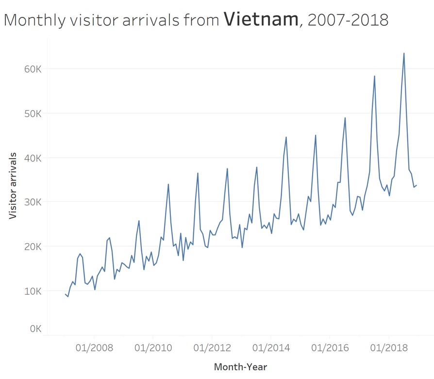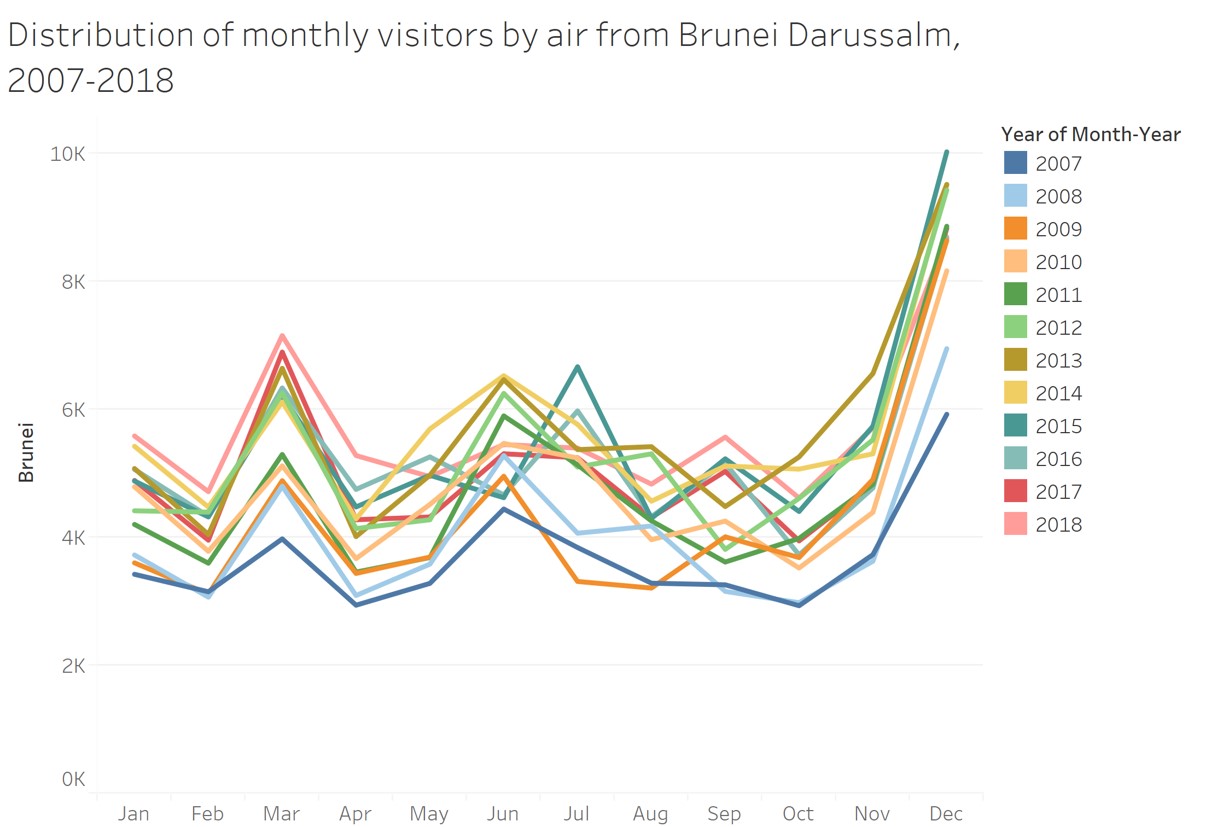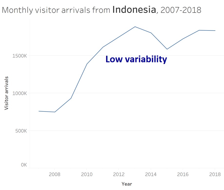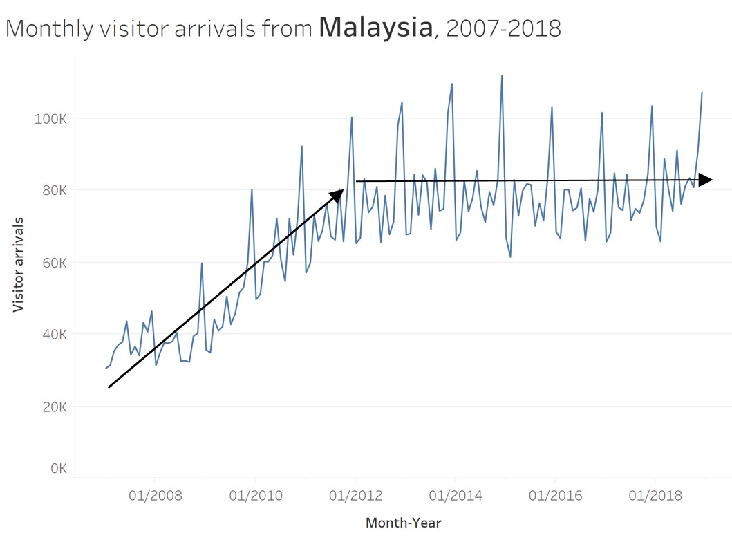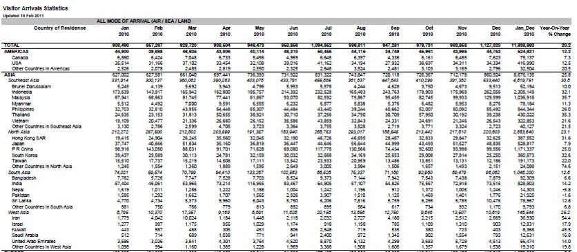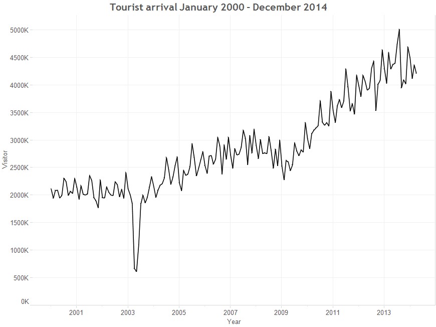 This line graph show the significant impact of SAR on the visitor arrivals pattern to Singapore.