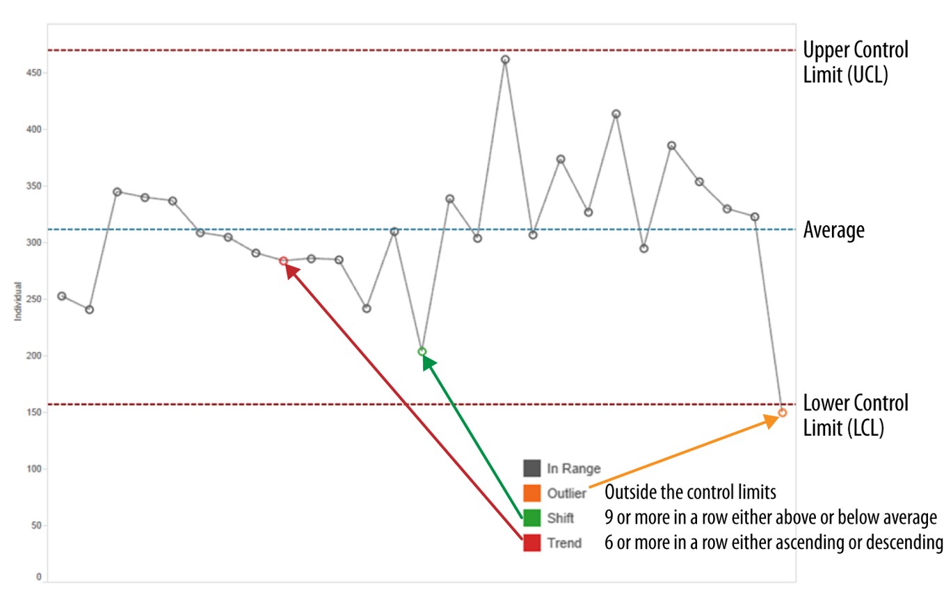 Control charts, also known as Shewhart charts (after Walter A. Shewhart) or process-behavior charts. They are a statistical process control tool used to determine if a manufacturing or business process is in a state of control. Beside the average line, there are two additional lines namely the upper control limit (UCL) and lower control limit (LCL). Any data points located beyond UCL or LCL will be flag out as anomalies.