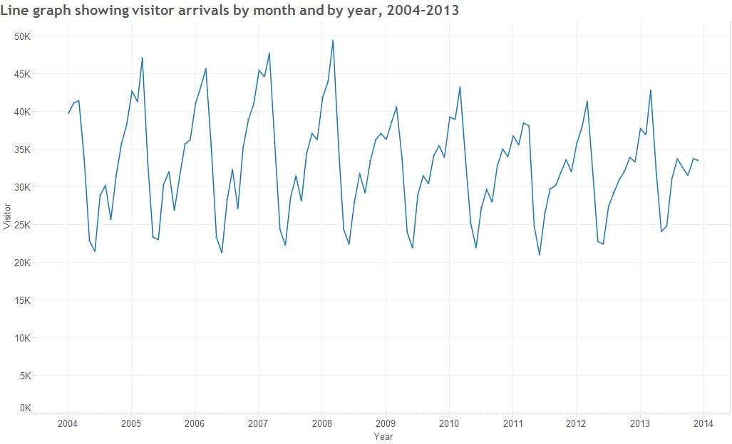 From the line graph, we can see that visitor arrivals from United Kingdom reach its peak on January and lowest on May every year.