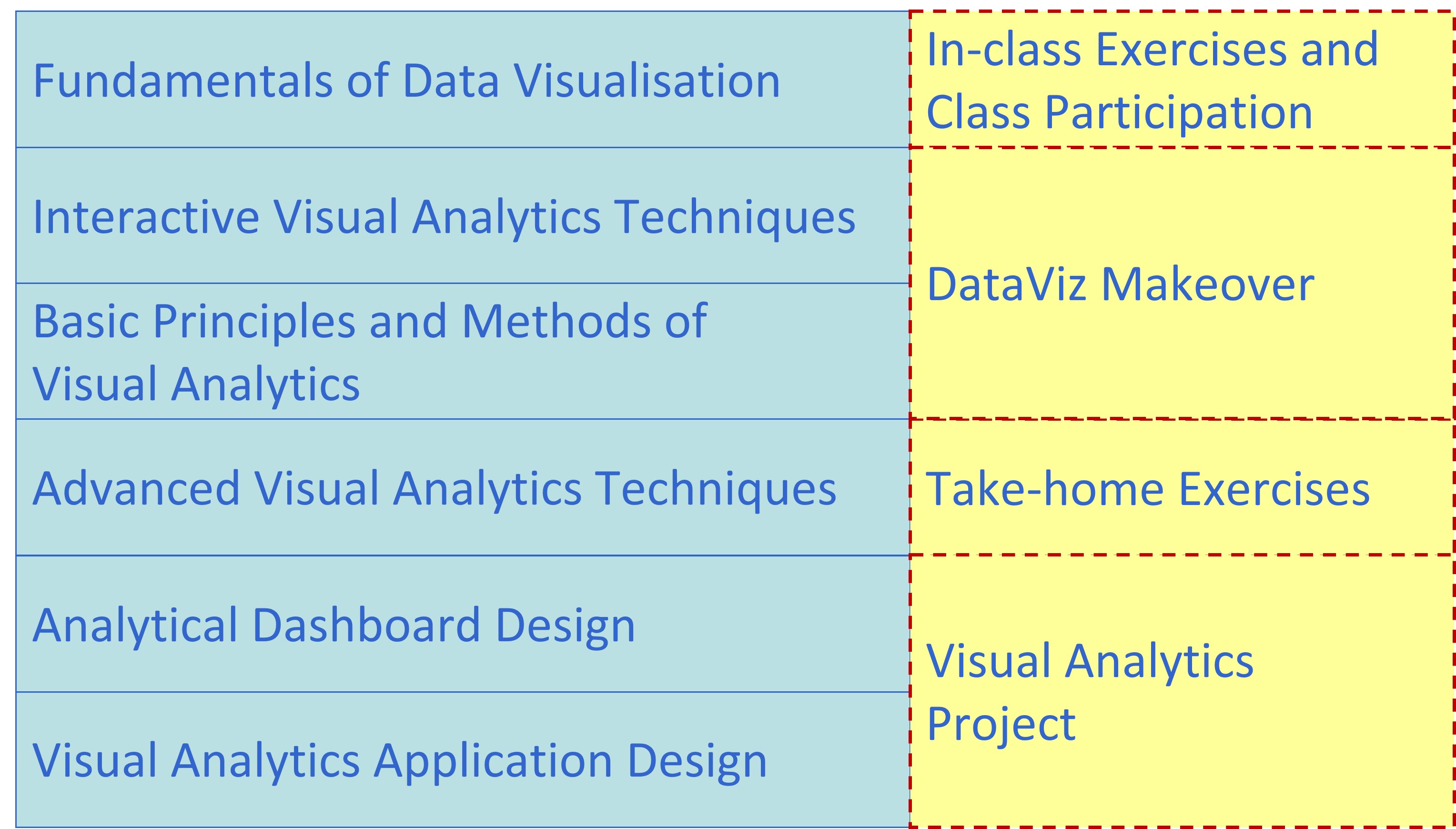 Pre-lesson videos/slides and recommended readings exercises will be released one week before the weekly lesson starts. A strict requirement for each class meeting is to complete the assigned readings and video before coming to class. Students are encouraged to post question or issue encountered while viewing the video or reading the recommended articles on Piazza. Student sharing of insights from readings of assigned materials on Piazza will form a large part of the learning in this course. After learning the data visuaisation concepts and methods from lesson materials, the hands-on exercises aim to provide students the opportunity to gain hands-on experience on using selected R packages. It is important for students to complete the hands-on exercises before class. This is because the in-class discussion will extend the methods learned from the hands-on exercise to advanced modelling.